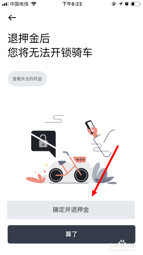 下一个页面中,系统会提醒:退押金后,您将无法开锁骑车。若是仍是退押金的话,就点击确定并退押金。