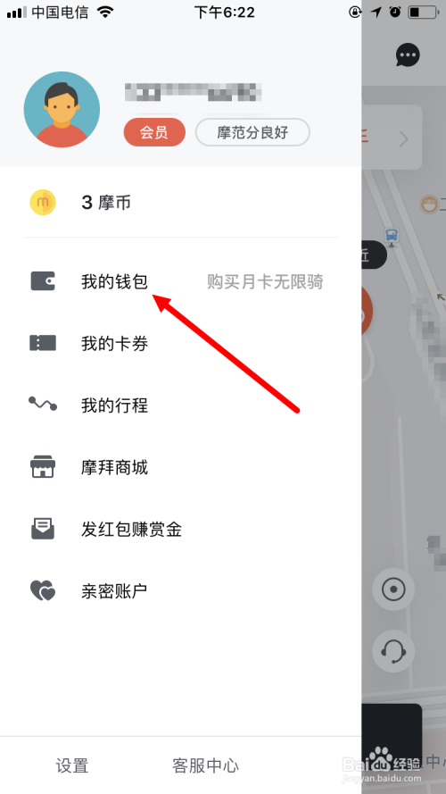 在手机上打开并登录摩拜单车App,并在首页面单击左上角的头像图标。