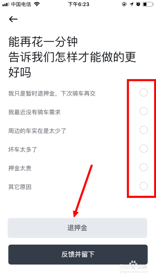 当然,还得选择一个退押金的原因,最后再点击退押金。如许,押金便会原路退回到付出账户。