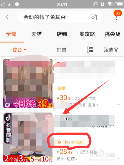 先打开手机淘宝,找到要采办的商品,商品旁边有【金币抵**%】的字样,就是买单时可以利用金币抵少量金额的商品,点击进入。