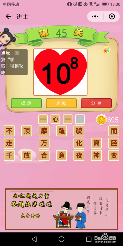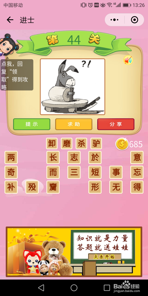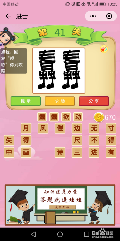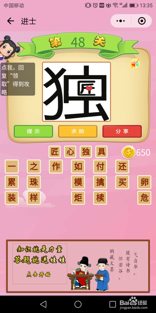 进士60关:一把匕首对着一小我,还有一个上山的箭头,后面是座黑色的山,找到谜底是【揭竿而起】。