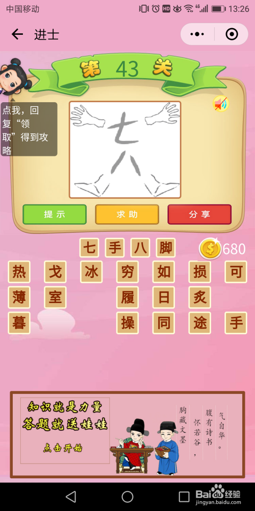 进士57关:一只手在用网子捕捉风,另一只手则捉着一个影子,谜底是【捕风捉影】。