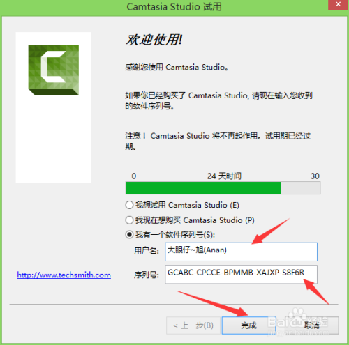 若是提醒需要注册或者只能试用的环境,那是因为还没破解完全,我们按照提醒,输入序列号,用户名,会提醒只有30天的试用期。