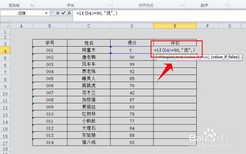 在E4单位格中输入函数=if(D4>=90,"优",),意思是若D4单位各类的数值年夜于等于90,那么就输出“优”;若D4单位格数值小于90就输出第2个if函数的值。