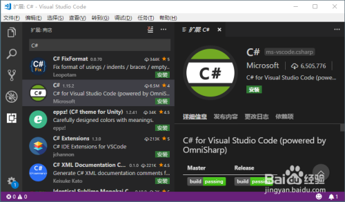 安装插件,打开VS Code 可以在左边看到五个Icon,点击最下面的那么Extensions图标,并在Extensions搜索框中输入C#,便可以找到C#插件安装,如下图所示: