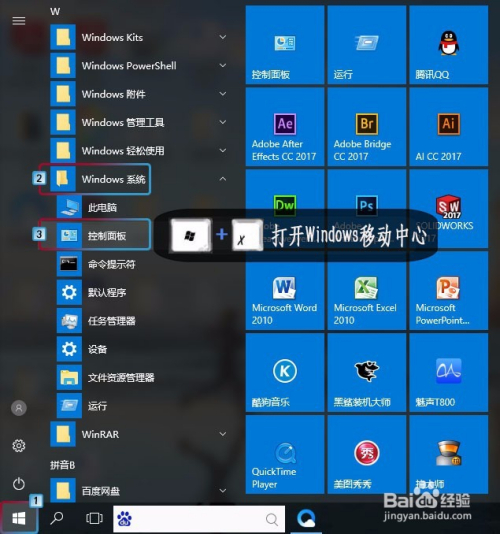 单击电脑桌面左下角‘Win徽标‘,弹出法式菜单,找到并打开'Windows系统‘文件夹,单击‘节制面板’按钮(或者在电脑桌面上按下Win+X快捷键,打开Windows移动中间,然后单击‘节制面板’选项)。(注:当前为Win10操作系统)