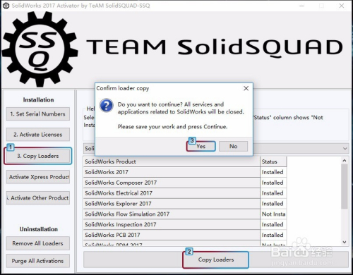 打开“Temp”文件夹,找到“SW.Activator.exe“文件,同样以鼠标右键【以办理员身份运行】打开,进入SSQ界面,单击【3.Copy Loaders】,然后单击【Copy Loaders】,接下来会弹出4个窗口,别离点击‘Yes’、“OK”、“Yes”、“OK”。