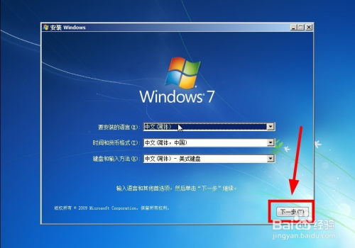 期待一段时候,进入Windows 7安装界面,点击“下一步”