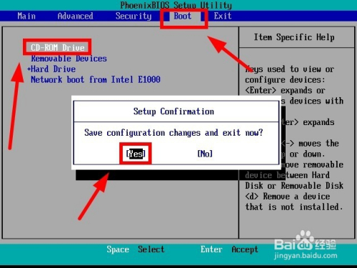 在BIOS中选择“Boot”选项,按住“Shift和+”键,将“CD-ROM Drive”置于第一启动项,接着按住“F10”保留设置,选择“Yes”保留