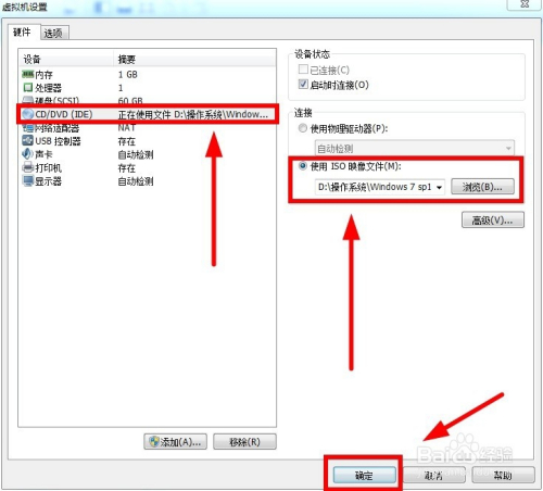 接着点击“CD/DVD”选项,选择“利用ISO镜像文件”(也就是操作系统镜像),然后点击“确定”