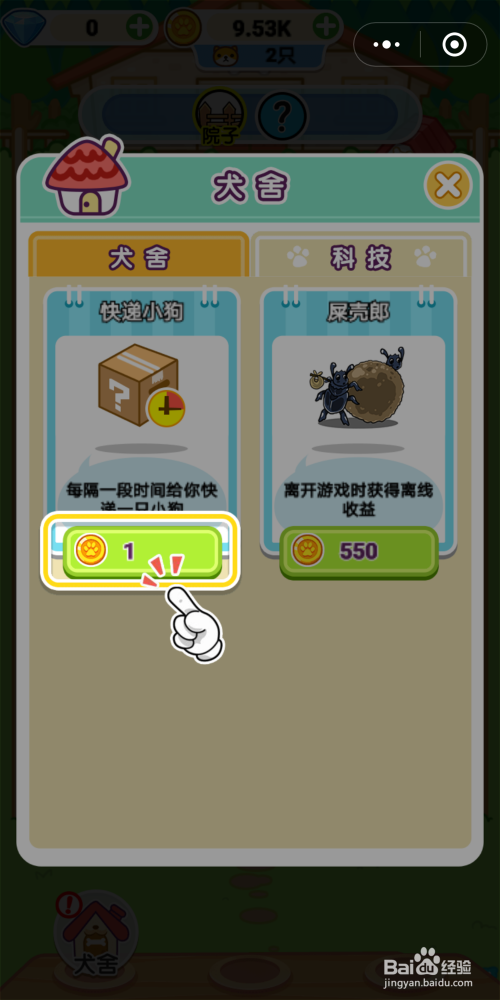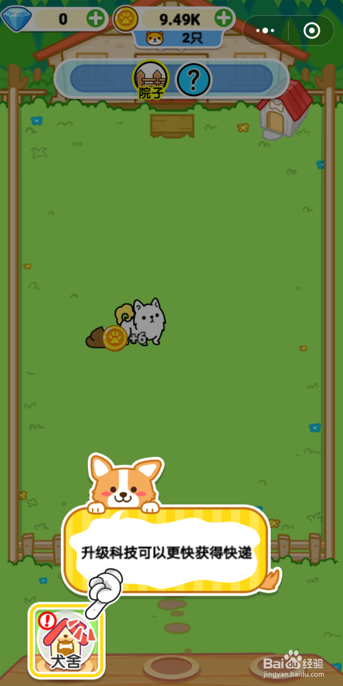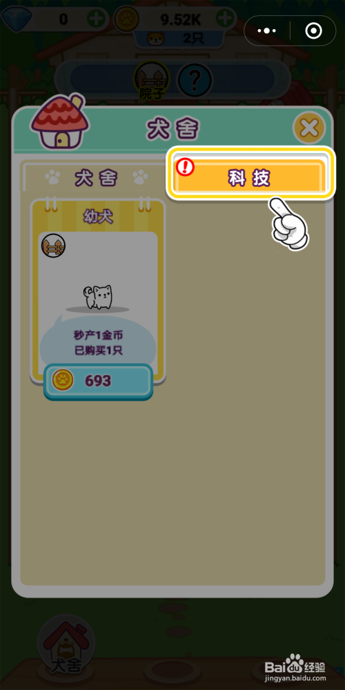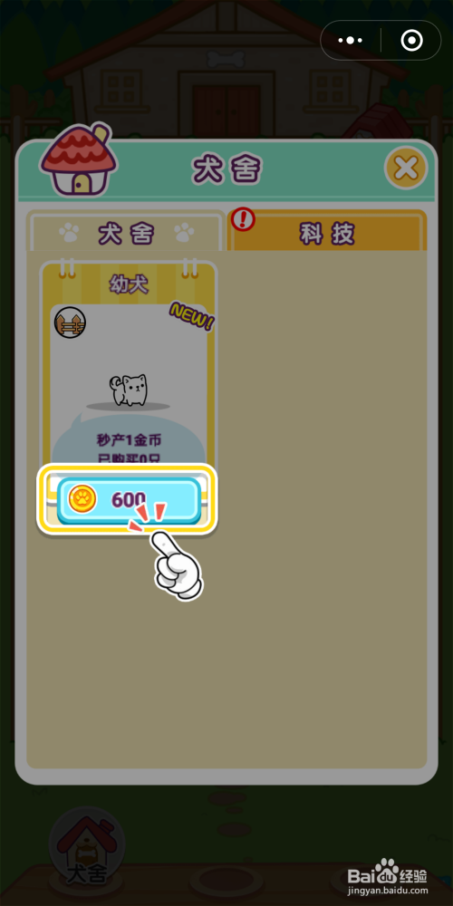 要进级科技的话,也是先要点击页面左下角的【犬舍】图标。