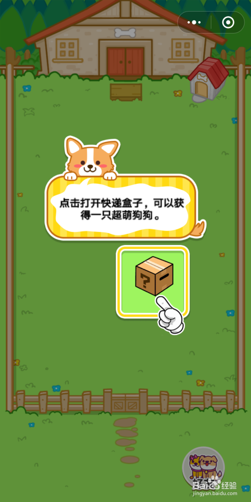进入游戏后,页面上有个快递盒子,点击这个盒子将盒子打开。打开盒子今后可以获得一只很萌的狗狗。