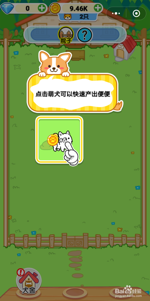 在页面上点击狗狗就会快速发生便便,狗狗的级别越高产出的便便越多,便便就是金币,可以用来进级科技,也可以用来采办更多或者是更高级的狗狗。