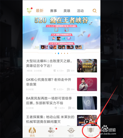 首先,我们在手机打开王者荣耀助手,在王者荣耀助首页面的右下角处找到“战绩 ”按钮,点击进入战绩页面 。