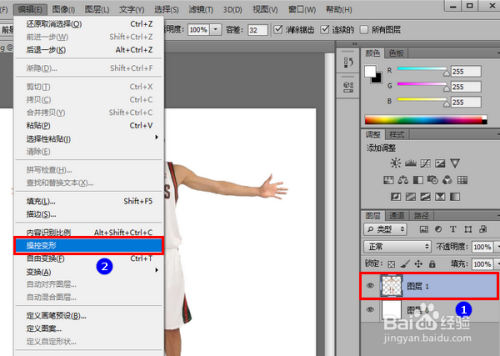 选中人物图层,然后点击菜单“编纂”-“操控变形”。