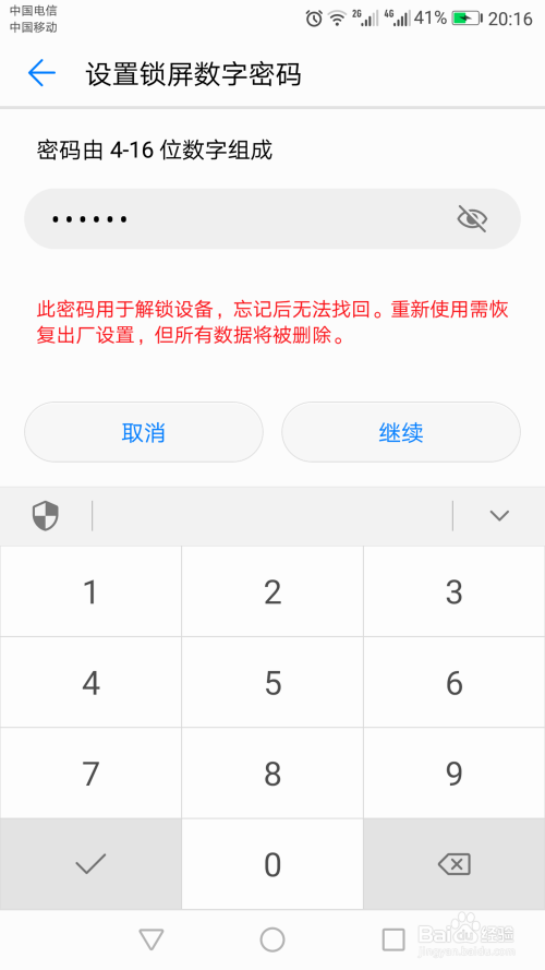 数字密码设置完当作后,会主动提醒是否继续“录入指纹”,以启用指纹快速解锁屏幕?