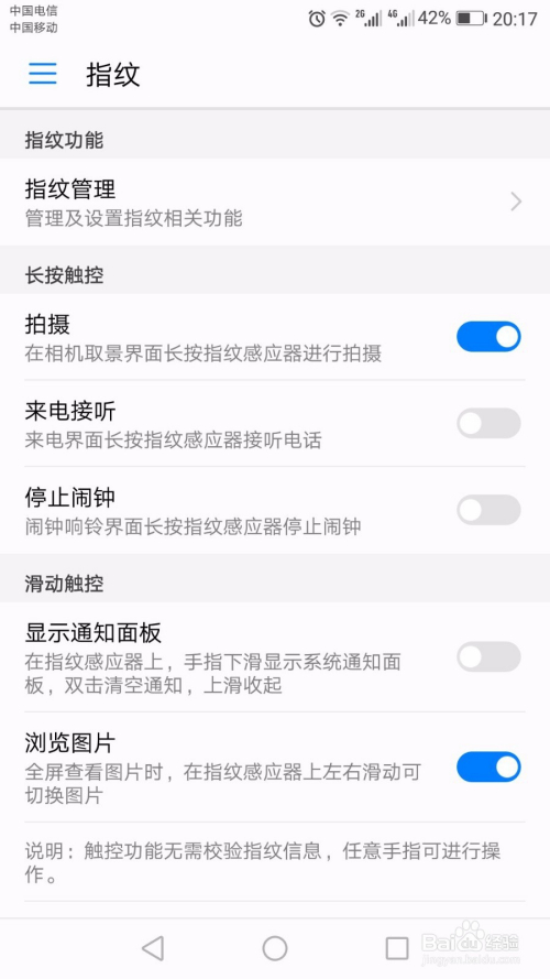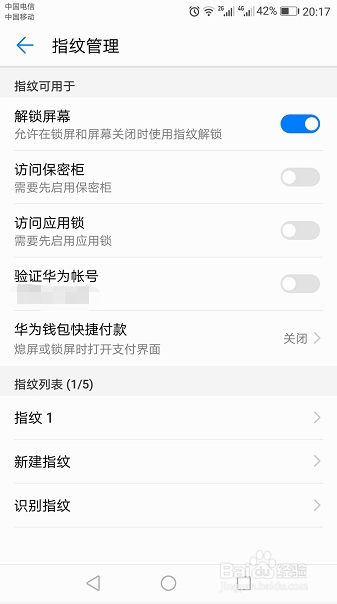 点击“确定”,指纹录入当作功后,会主动进入“指纹办理”界面,在这里可以开启需要指纹办理的项目,将各项最右侧的开关置于开启位置就可以。