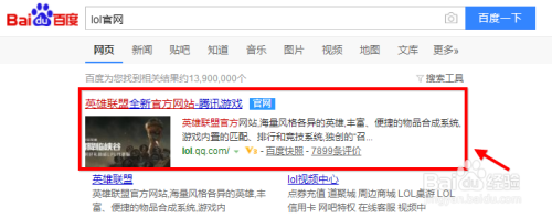 打开全能的百度搜刮引擎,输入关头词lol官网,点击有官网字样的进入。