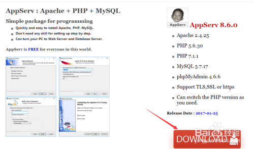 首先,打开AppServ的官方网站,不知道的可以经由过程搜刮引擎搜刮一下AppServ,点击最上方的官网即可,然后在官网首页傍边点击右下角的DOWNLOAD按钮,如下图所示。