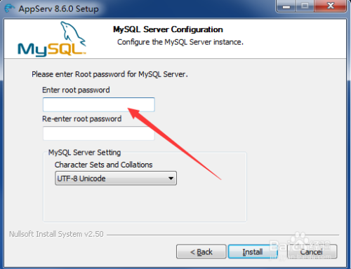 接下来输入本身想要设置的数据库密码(8位以上的),输入两遍,完当作后点击install