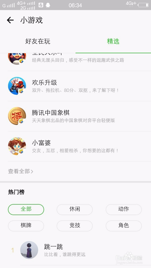 进入微信小游戏界面之后,可以看到这里介绍了已发布的小游戏,下方有“查看全数”这四个字,点击查看全数进入,进入的新页面有两个板块,一个老友在玩,一个精选,可以点击精选,这里面有游戏分类,包罗休闲、动作、棋牌、竞技、脚色这几类,适合分歧的人群,可以在这里面选择本身喜好的游戏试玩。