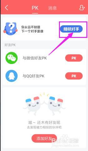 点击【随机敌手】。这个就可以随机与在线玩PK的人一路PK。当然也可以选择QQ老友或是微信老友。