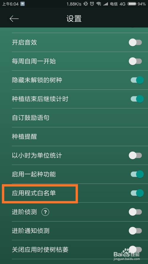 [第五步] 进入“应用程式白名单”界面今后,可以对所有应用设置,打钩的则是白名单,不会造当作树的枯萎,相反,若是运行了没有勾选的应用,树就会枯萎。