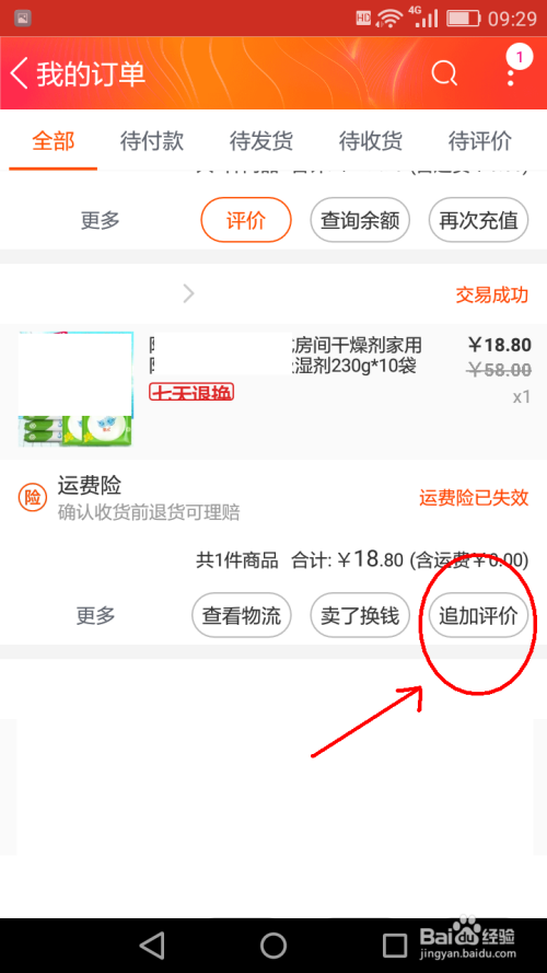 在我的订单页面找到所需追加评价的商品,点击”追加评价“。