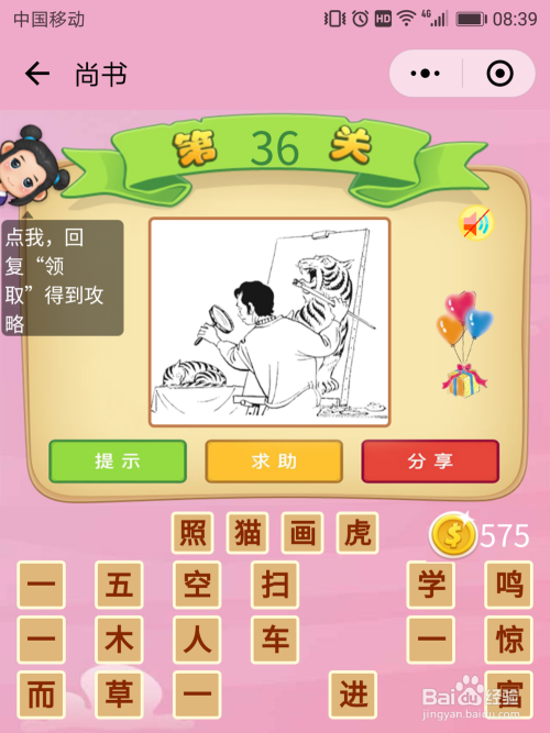 尚书36关谜底:一小我在画画,画的是只山君,而这位画家则是照着一只猫在画,这种现象叫【照猫画虎】。