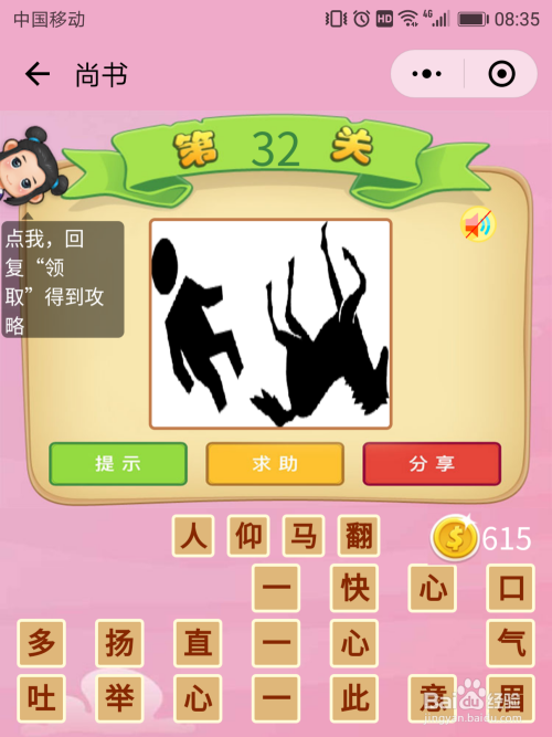 尚书32关谜底:人和马都倒在了地上,那么就是【人仰马翻】。