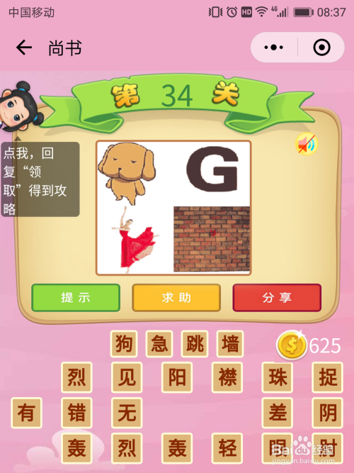 尚书34关谜底:最难猜的是字母G的寄义,其他都好猜,经由过程其他三个字可以猜测出G代表焦急,那么这就是【狗急跳墙】。