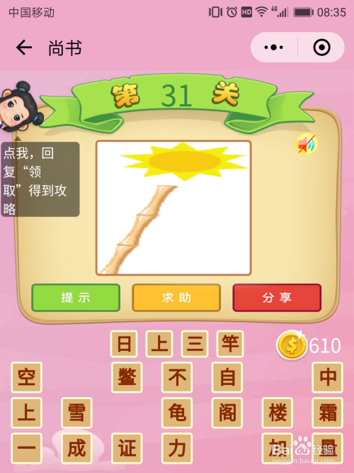 尚书31关谜底:太阳简称日,竹竿上有三个节,那么就是三竿,这就是【日上三竿】。