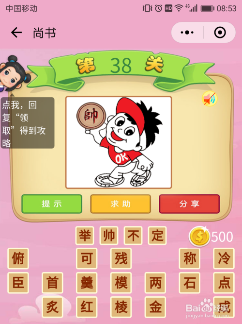 尚书38关谜底:一小我举着个帅棋,这就是举帅。这小我在是动着的,那么就是【当机不断】。