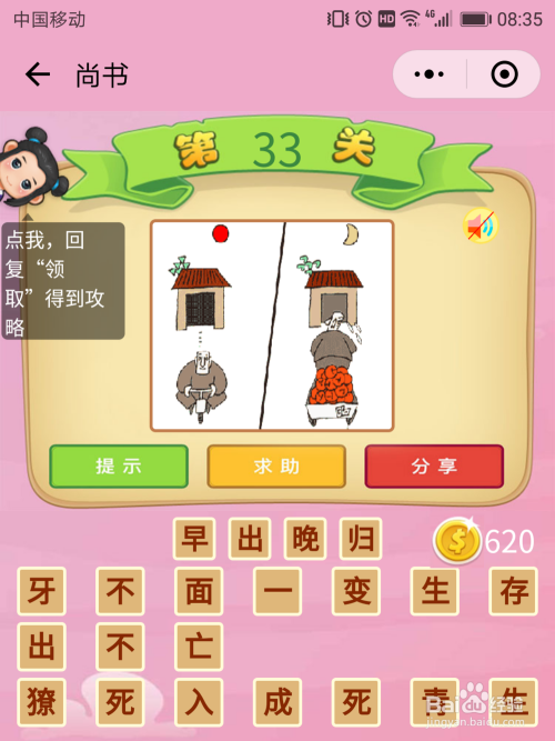 尚书33关谜底:太阳出来时出门,月亮升起来后回家,这就是【早出晚归】。