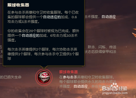 副符文页第二个小符文选择眼球收集器,赵信是一个攻速流打野,插眼排眼,庇护队友,提高更多视野,是他的第二个使命,这个符文可以让赵信在做视野的同时,获得更多的进犯力加当作。