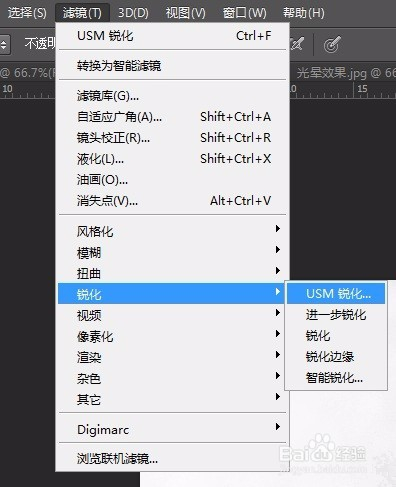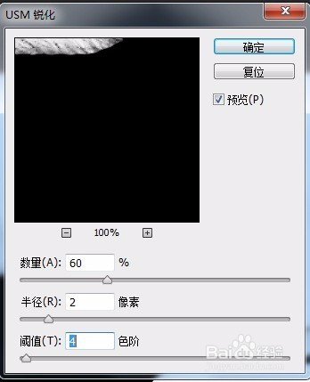 如图示,调出”USM锐化“对话框,在对话框设置参数。