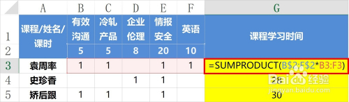 先锁定课时数区域,然后利用每个学员所学课程的标注"1"与之相乘,然后乞降。