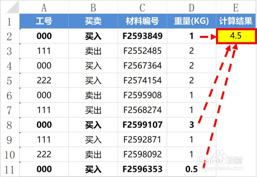 计较工号为000,买入的,材料编号为"F259****"的总重量。
