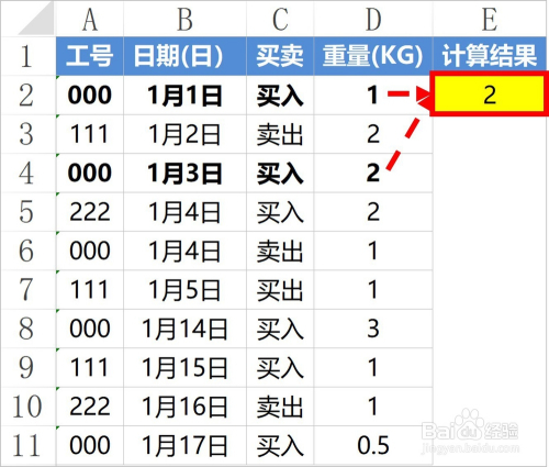 下图中,我们要计较工号为000,1号到15号时代,买入的,小于等于2KG的物品的总次数。