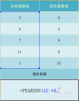 输入函数公式,即=PEARSON(A2:A6,B2:B5);