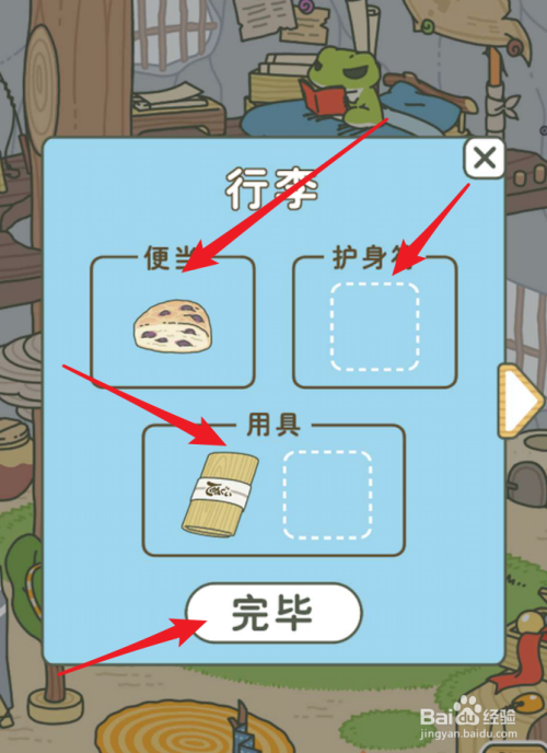 点击后,会弹出窗口,我们就要为小青蛙筹办观光的行李了,我们点击食物,就可以选择适才采办的工具了。其他工具也是一样的可选择。