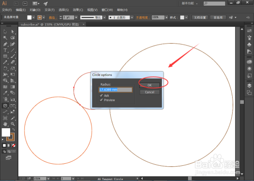 在弹出的选项框中设置该相切圆的半径大小,然后点击【OK】按钮,如图: