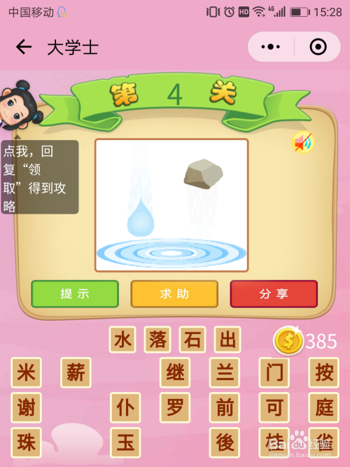 年夜学士第4关谜底:图上良种事物,一种是水,一种是石头,最先大师想到的可能是积习沉舟,可是石头上没有洞,那么就应该是【内情毕露】了。