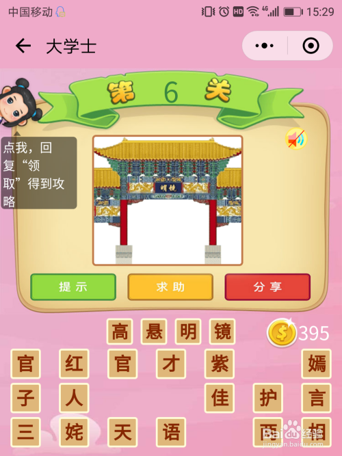 年夜学士第2关谜底:按照这小我手举起的工具上面的文字和站立的位置,猜到他是个【顶天登时】的人。