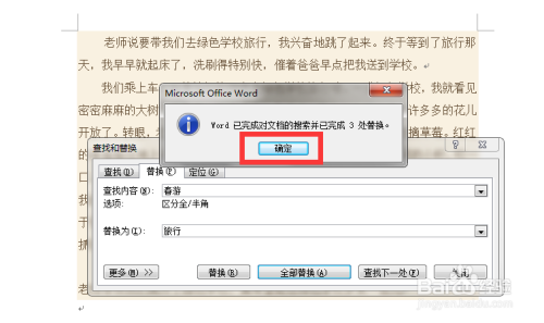 在【替代为】后边的空白处输入【观光】,然后单击下方的【全数替代】,就将文章中所有的【春游】替代为【观光】了,在出来的提醒栏中点击【确定】。