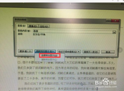 在出来的选项中选择【全数凸起显示】,就可以看到文章中所有【春游】都被标识表记标帜出来了。