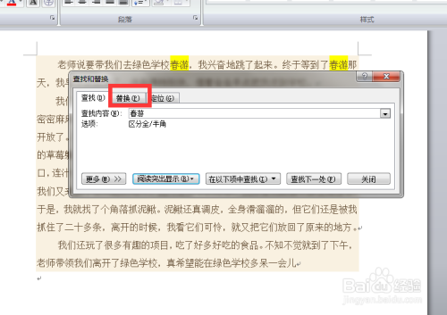 单击【查找】后,出来一个对话框,在查找内容中输入需要查找的词语(我们以【春游】举例)点击 【阅读凸起显示】。