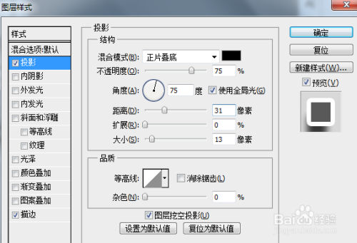 再对图层1应用“投影”图层样式,这里将角度设为75°,距离为31像素,大小为13像素。
