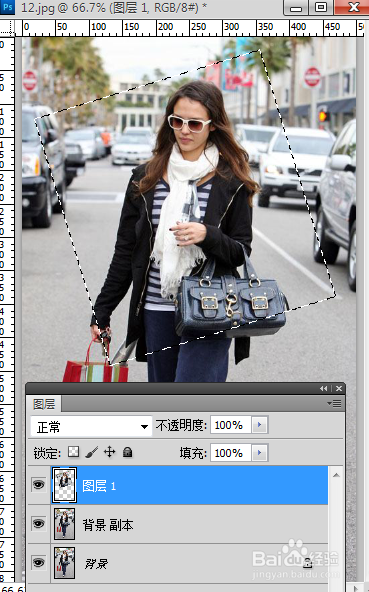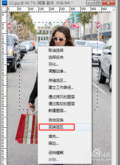 框选好区域之后,右击,选择“变换选区”号令,将框选区域扭转一个合适的角度,再Ctrl+J复制该区域,获得图层1。