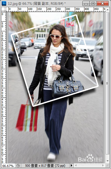 注重:在这里不克不及利用快捷键Ctrl+T来变换选区,因为此时若操纵该快捷键来变换选区,则会使在框选规模内的局部照片整体发生变换,发生错位。